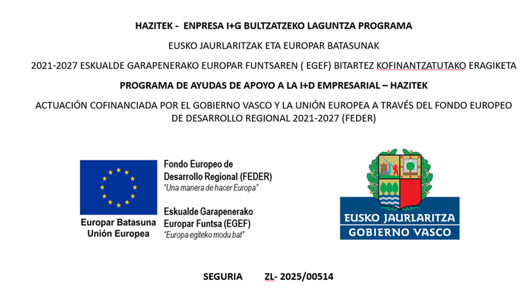 EXTERNALIA junto con PRECOIN, CEMOSA, SENSPAIN, URBELAN y TECNALIA participan en el Proyecto de Investigación SEGURIA (ZL-2025/00514), dentro del programa Hazitek, financiado por el Gobierno Vasco y por el Fondo Europeo de Desarrollo Regional (FEDER).