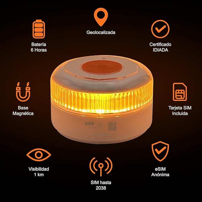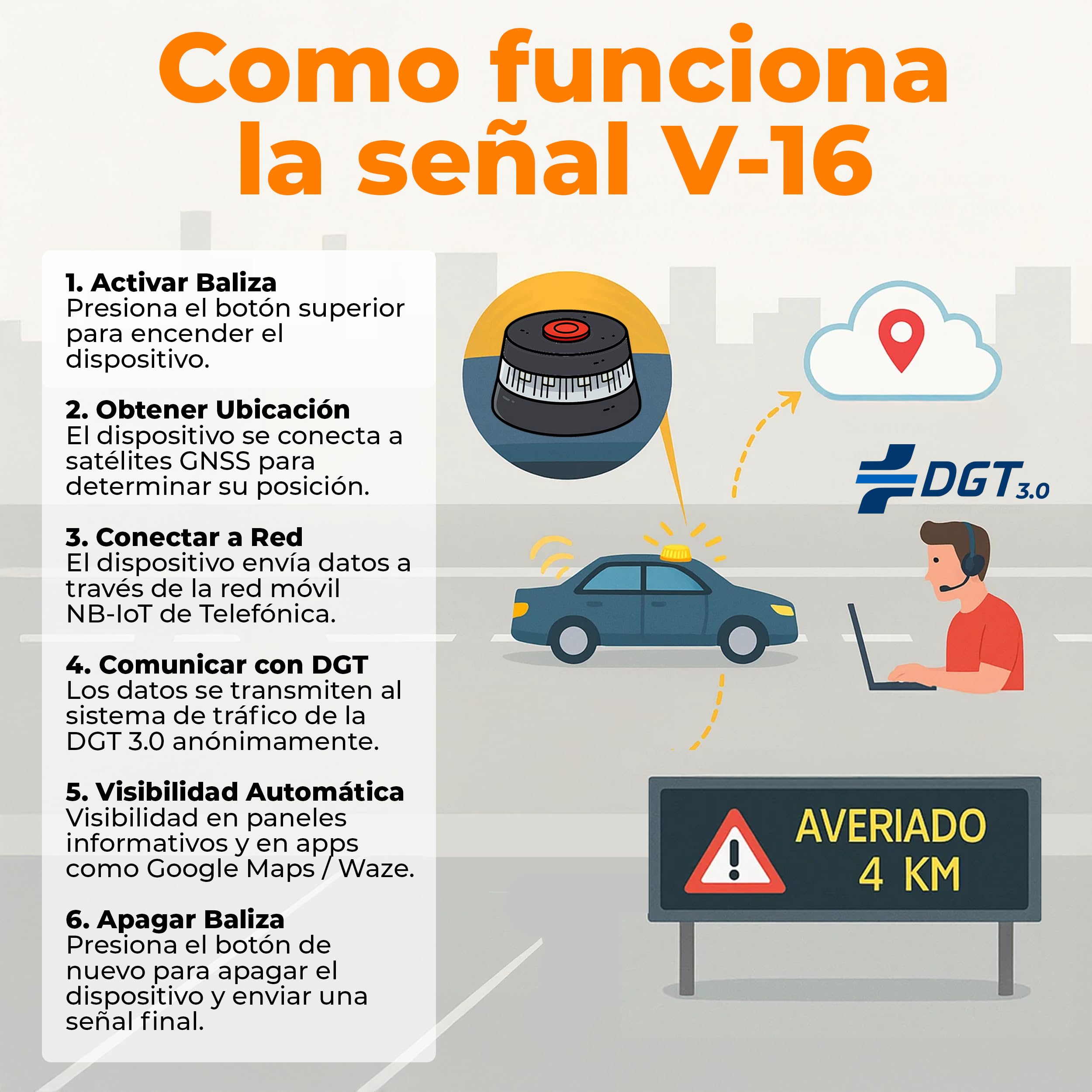 Su versión conectada (homologada) se adhiere magnéticamente, emite una luz visible a larga distancia y, al activarse, comunica automáticamente la ubicación del vehículo a la plataforma DGT 3.0, alertando a otros conductores y sistemas de tráfico sin necesidad de que el conductor salga del coche